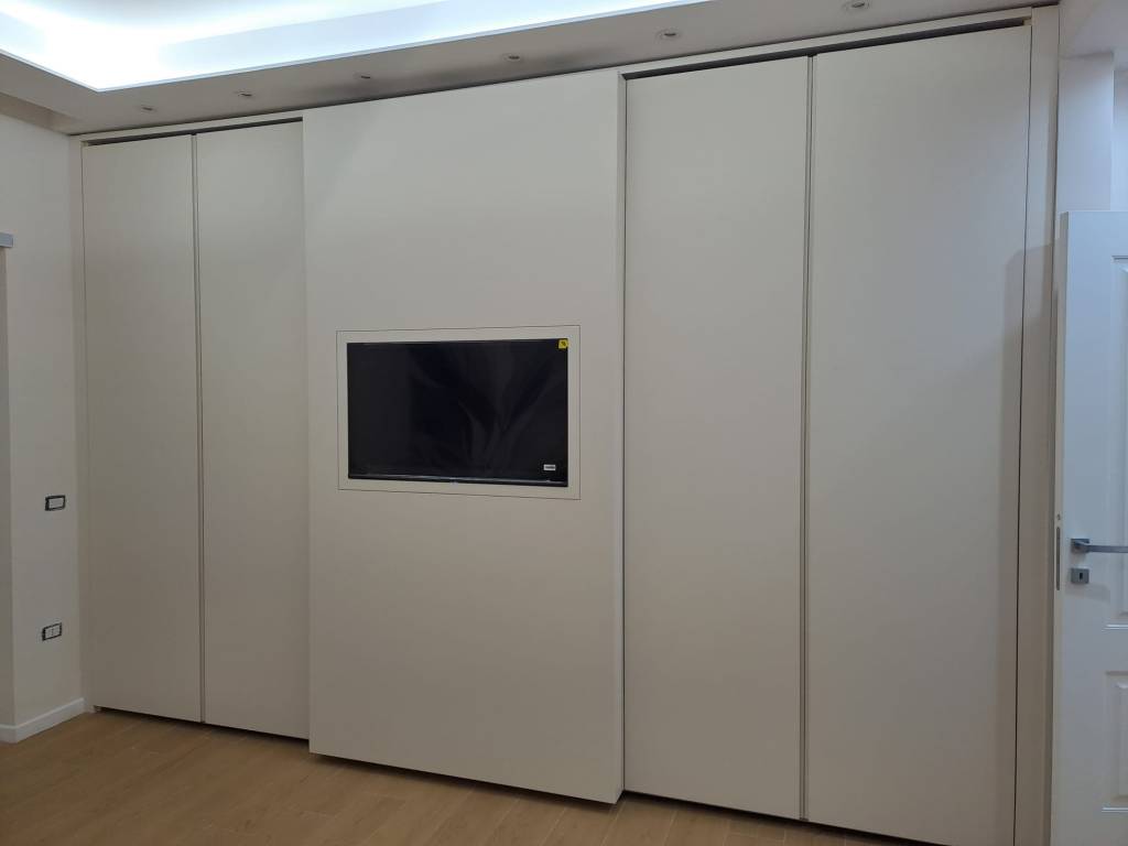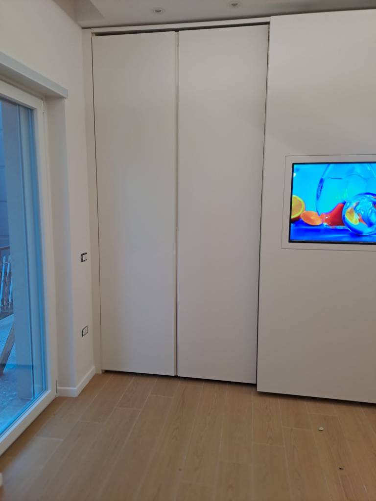 Il vero cuore del progetto è senza dubbio l’integrazione del televisore in una delle ante scorrevoli. Una scelta che unisce tecnologia e design in modo discreto ed elegante.