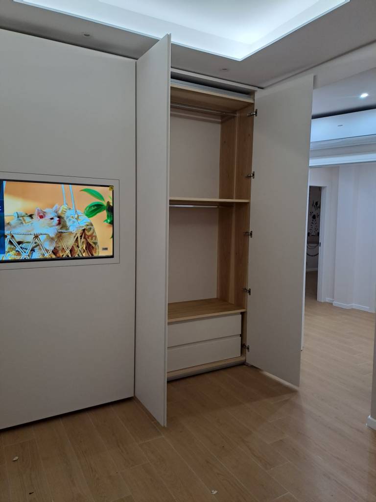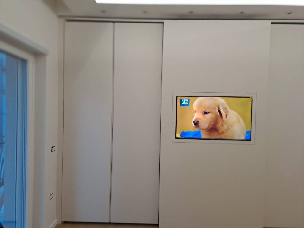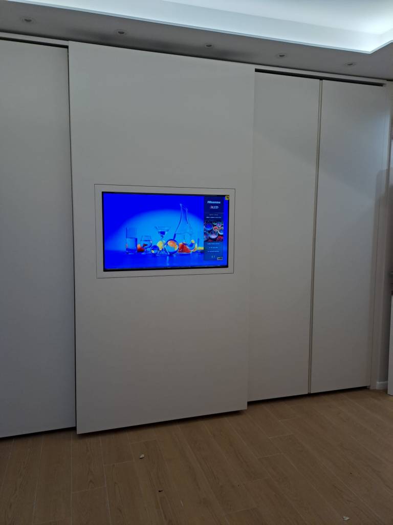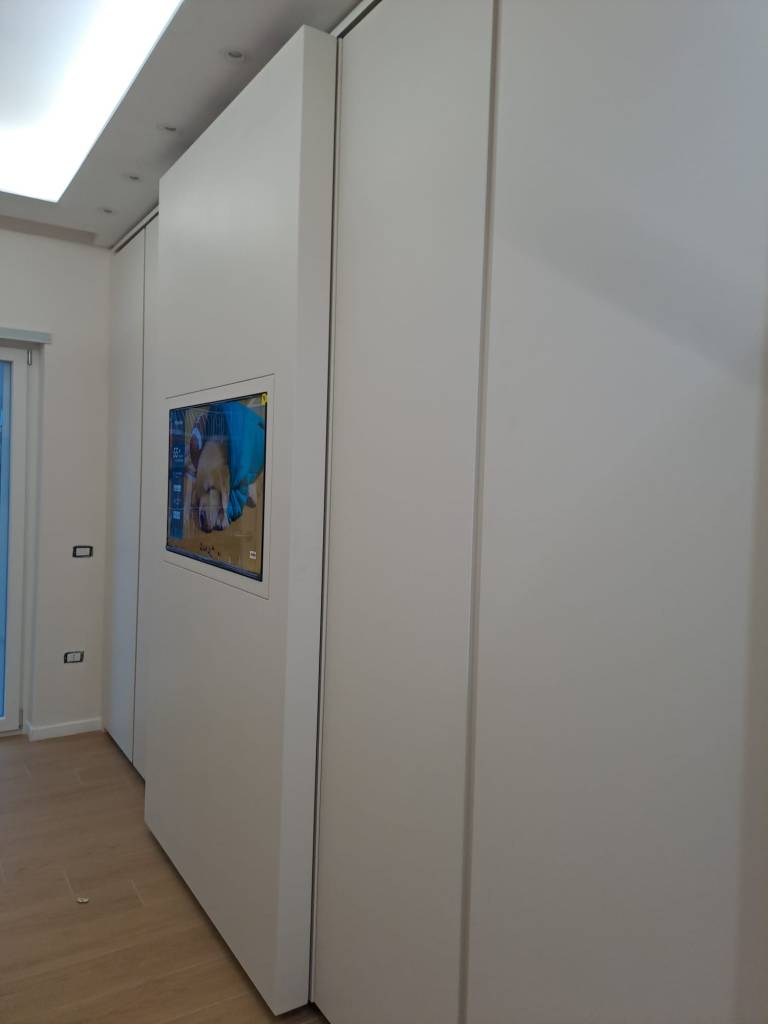 Il televisore è incassato a filo anta, risultando completamente integrato nella superficie. Quando l’anta è chiusa, la TV diventa parte del mobile; quando è in uso, si trasforma in un elemento funzionale perfettamente visibile e comodo da utilizzare.