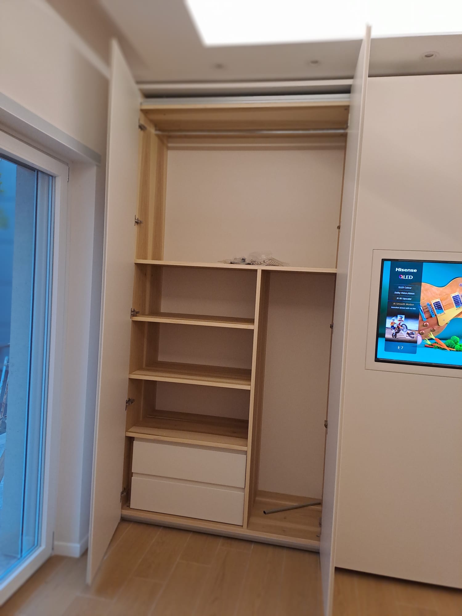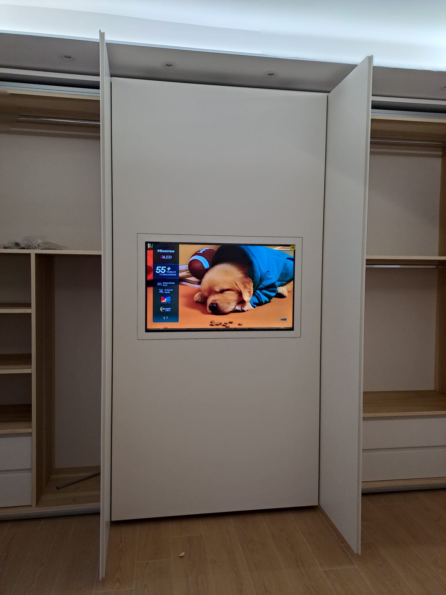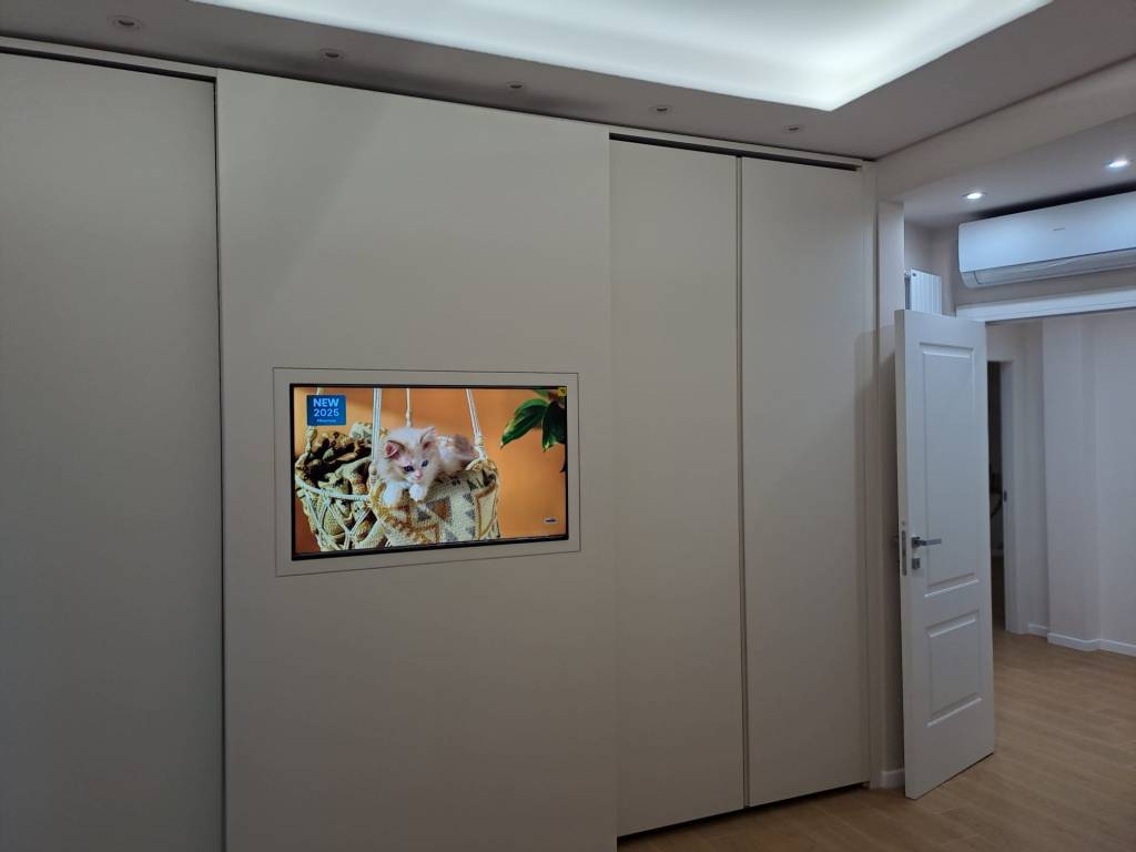 Il televisore è incassato a filo anta, risultando completamente integrato nella superficie. Quando l’anta è chiusa, la TV diventa parte del mobile; quando è in uso, si trasforma in un elemento funzionale perfettamente visibile e comodo da utilizzare.