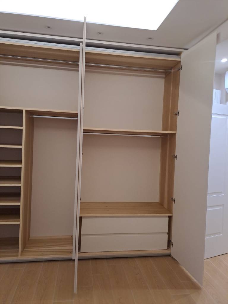 Il punto di partenza è stato lo studio dell’ambiente: una stanza luminosa, moderna, con linee pulite. Il cliente desiderava un armadio capiente ma visivamente leggero, che si integrasse perfettamente con l’architettura esistente senza appesantirla.